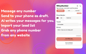 WAnyNumber is een handige Chrome-extensie die gebruikers in staat stelt om WhatsApp-berichten te verzenden naar elk telefoonnummer zonder dat ze deze eerst als contact hoeven op te slaan. Deze tool is ideaal voor professionals zoals vastgoedagenten, verkoopteams en recruiters die regelmatig communiceren met nieuwe contacten. Met functies zoals AI-gegenereerde berichten, sjablonen en de mogelijkheid om berichten als concept op te slaan, biedt WAnyNumber een snelle en efficiënte manier om berichten te versturen.